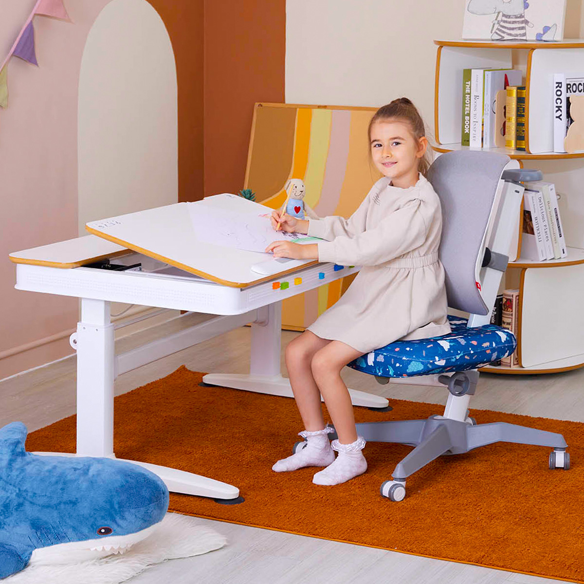 Растущая парта E6-140S станет прекрасным дополнением к интерьеру любой комнаты. Столешница выполнена из прочного МДФ, который защищен от царапин. Углы парты скруглены, защищая ребенка от возможных повреждений. Для нивелирования неровностей пола, парта оснащена регулируемыми подпятниками, они помогут расположить парту ровно и без покачиваний на любой поверхности. По бокам парты расположены специальные LEGO-блоки. Ребенок может настроить их дизайн под своё настроение или интерьер комнаты.