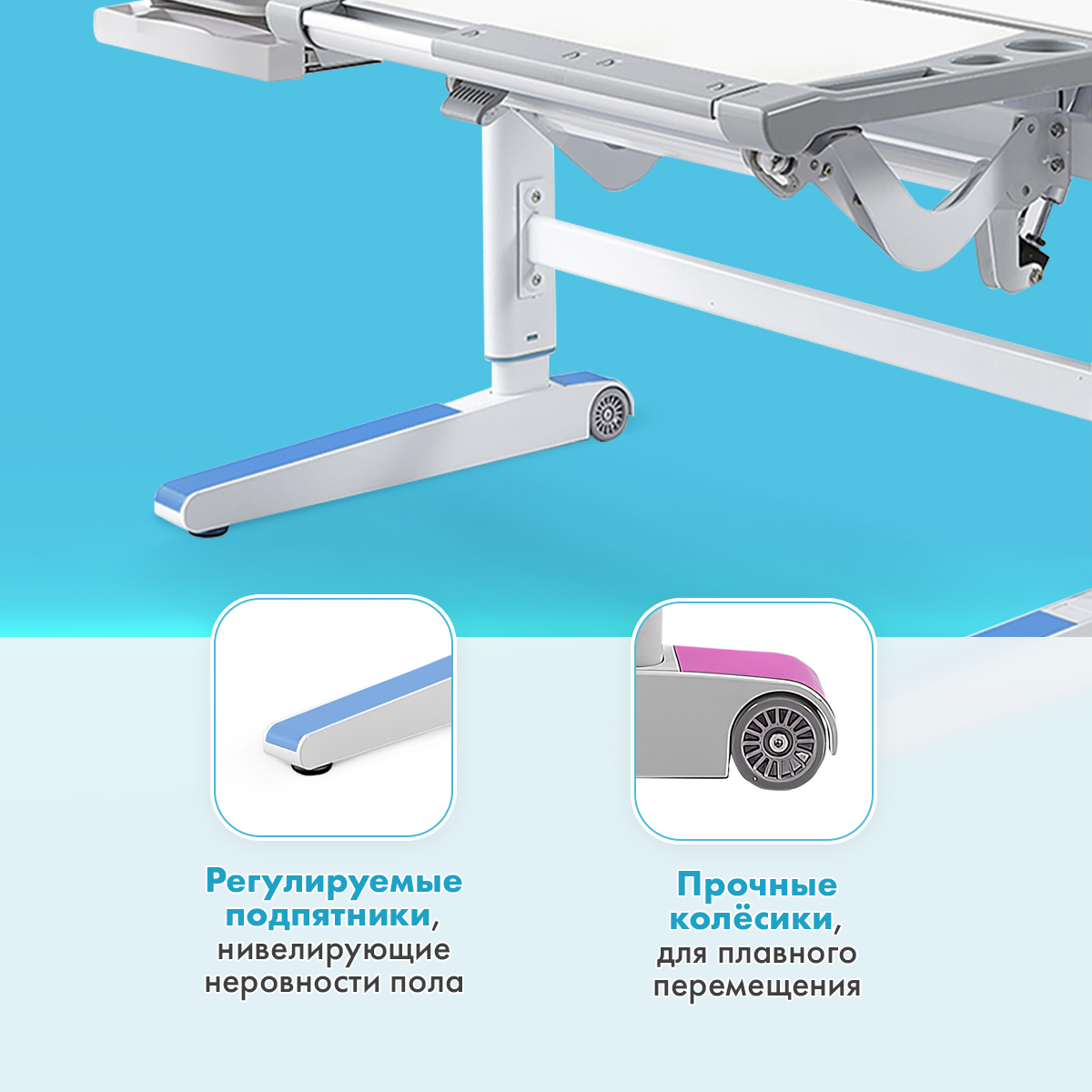 На задней части ножек у парты расположены специальные колесики для простого и быстрого перемещения по комнате, а настраиваемые подпятники помогут нивелировать неровности пола.